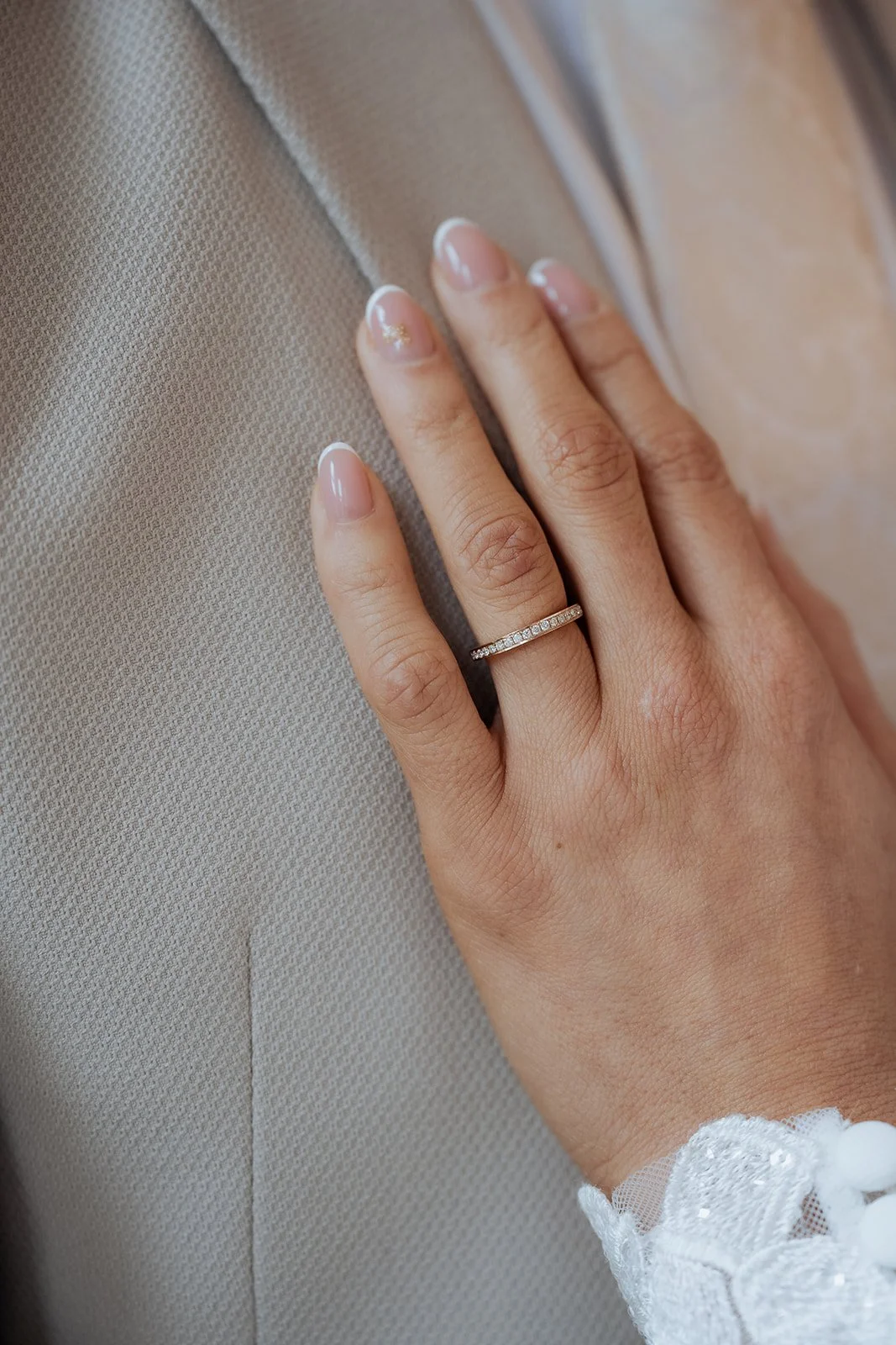 Sophie wore a stunning Maggie Sottero wedding dress with detachable lace sleeves, bought at the same wedding dress shop that I bought my own at Belle & Bouquet. Her earrings were from one of my favourite brands that I have worked with Kiri & Belle who make handcrafted fresh pearl jewellery. And then the shoes, oh the shoes! Sophie wore a pair of gold, glittering Sophie Webster shoes and had a matching pair for her daughter. Finally, Sophie wore one of my own bridal robes, a short silky robe with feathered sleeves while she got ready. Find your wildheart bridal robe here.